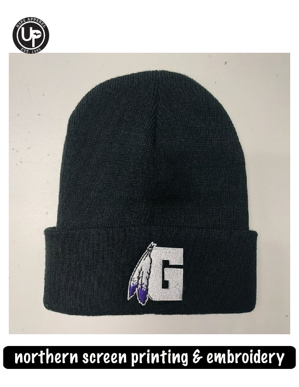 A winter cuffed beanie (SP12) with a white G and purple, white, black feathers embroidered on the front center of the hat.
